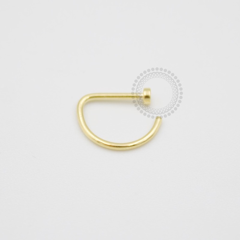 Descrição: D Ring para a aba nasal proporciona um visual delicado e elegante. Fabricado em aço 316L banhado a ouro 18k, ele é colocado de dentro para fora, ficando como uma argola. Esse design garante que a joia se acomode confortavelmente na perfuração, sem risco de machucar, pois as bordas são suaves e arredondadas.
