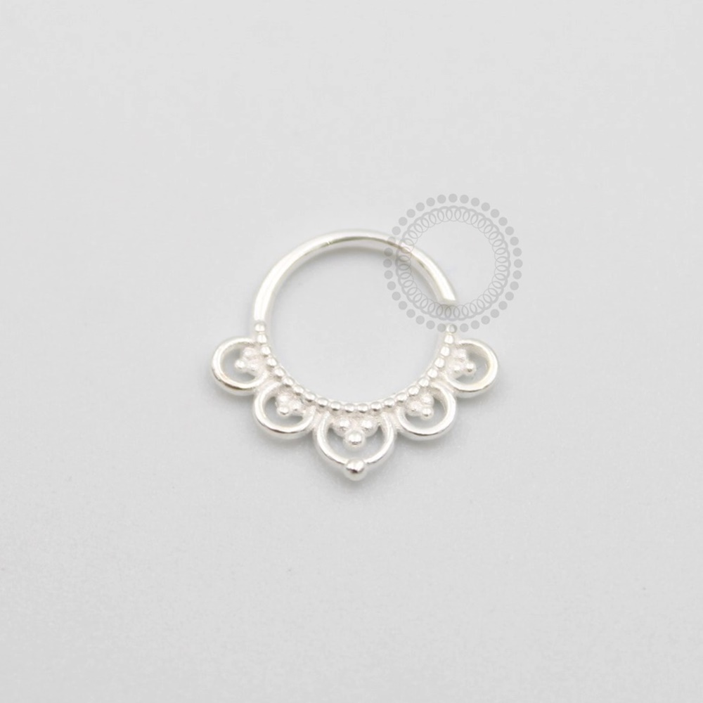 Descrição: Ideal para septo, daith, cartilagem, lobulo, entre outros piercings, oferecendo um ajuste confortável e seguro. É uma joia cheia de estilo.