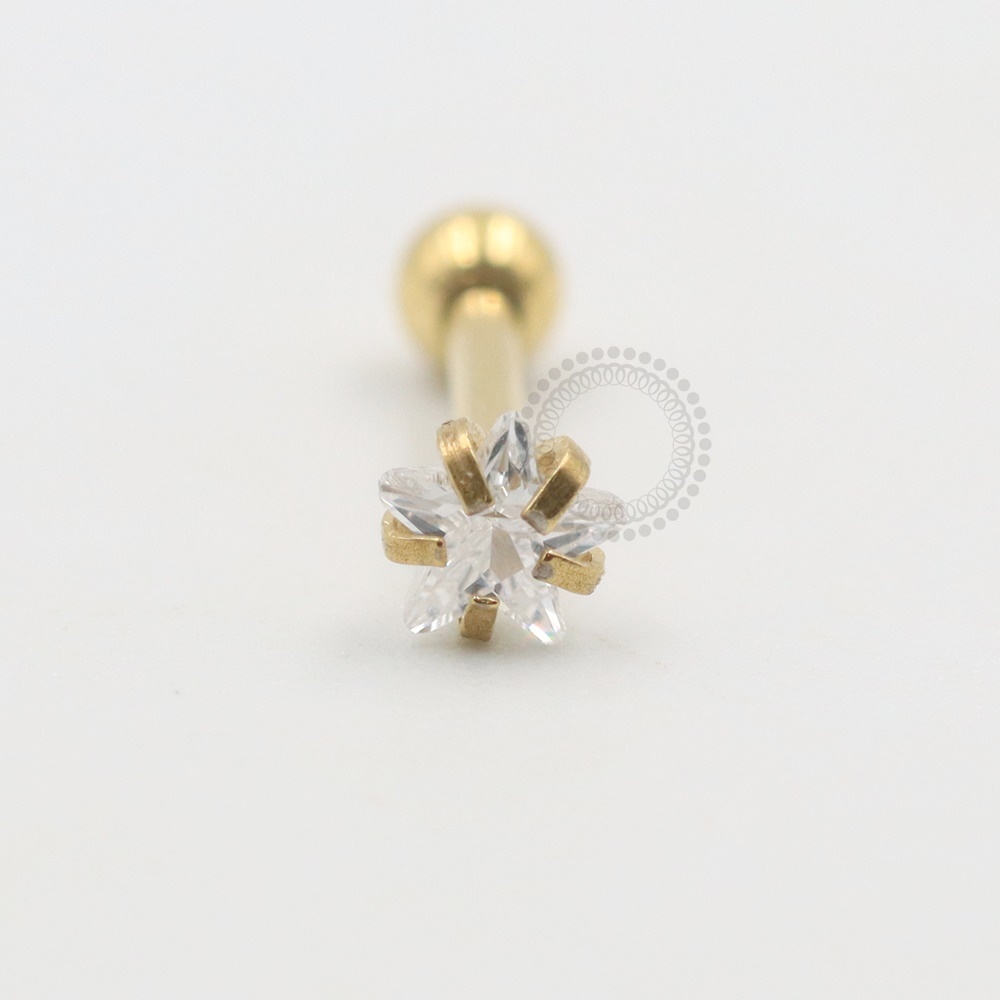 Descrição: Ideal para cartilagem, lóbulo, helix,tragus, entre outros piercings, oferecendo um ajuste confortável e seguro. É uma joia cheia de estilo.