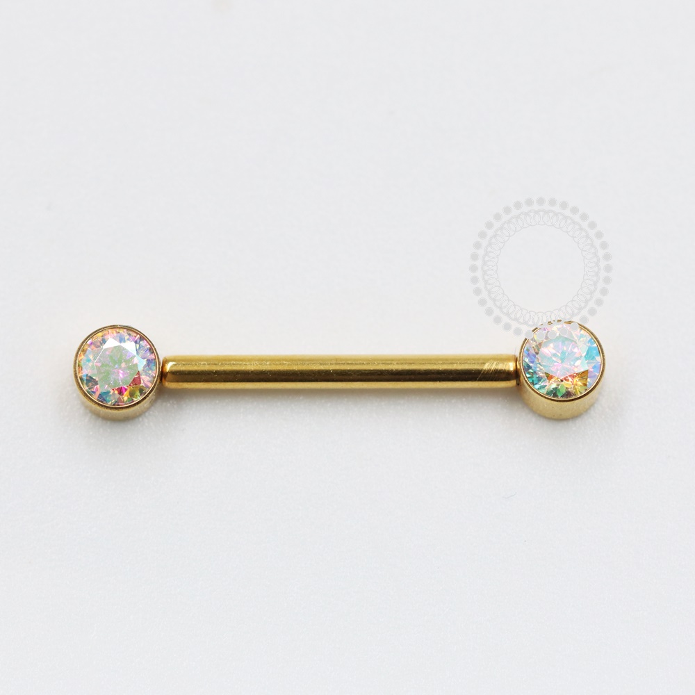 Titânio PVD Gold: É um material altamente durável e leve, que passa por um processo de deposição a vapor (PVD) para receber uma camada de ouro. Esse tratamento não só confere uma aparência luxuosa e brilhante, mas também aumenta a resistência à corrosão e ao desgaste. O titânio é conhecido por ser hipoalergênico, tornando-o uma excelente escolha para joias e piercings, especialmente para pessoas com pele sensível. A combinação de titânio com o acabamento PVD Gold oferece uma opção elegante e resistente, ideal para uso diário.