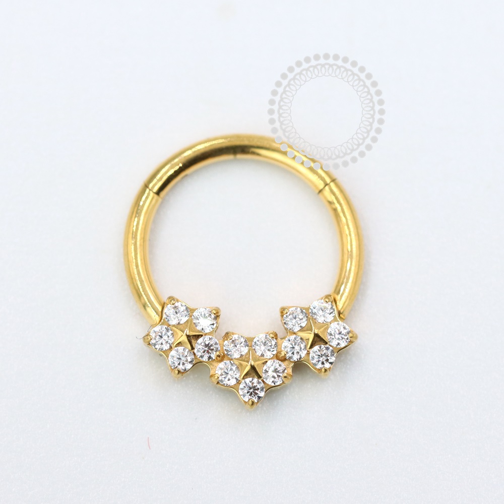 Descrição: Ideal para cartilagem, lóbulo, helix,septo, daith, entre outros piercings, oferecendo um ajuste confortável e seguro. É uma joia cheia de estilo.