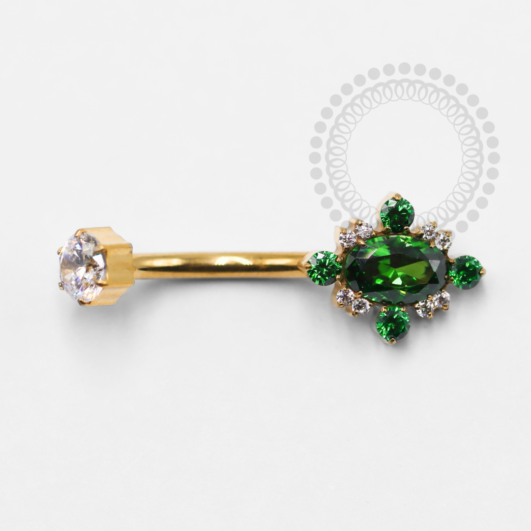 Descrição: Ideal para perfuração de umbigo, oferecendo um ajuste confortável e seguro. É uma joia cheia de estilo. O design curvado da haste permite um melhor encaixe na anatomia do corpo, minimizando o risco de irritação. Além disso, é fácil de limpar e manter, o que é essencial para garantir a saúde da perfuração.