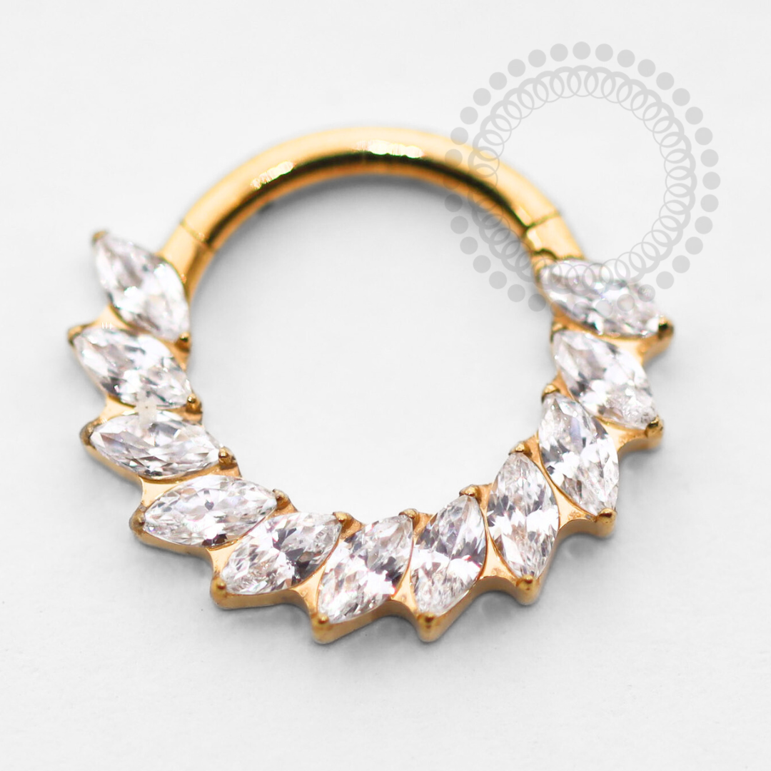 Descrição: Ideal para septo, daith, cartilagem, lóbulo, helix, entre outros piercings, oferecendo um ajuste confortável e seguro. É uma joia cheia de estilo.