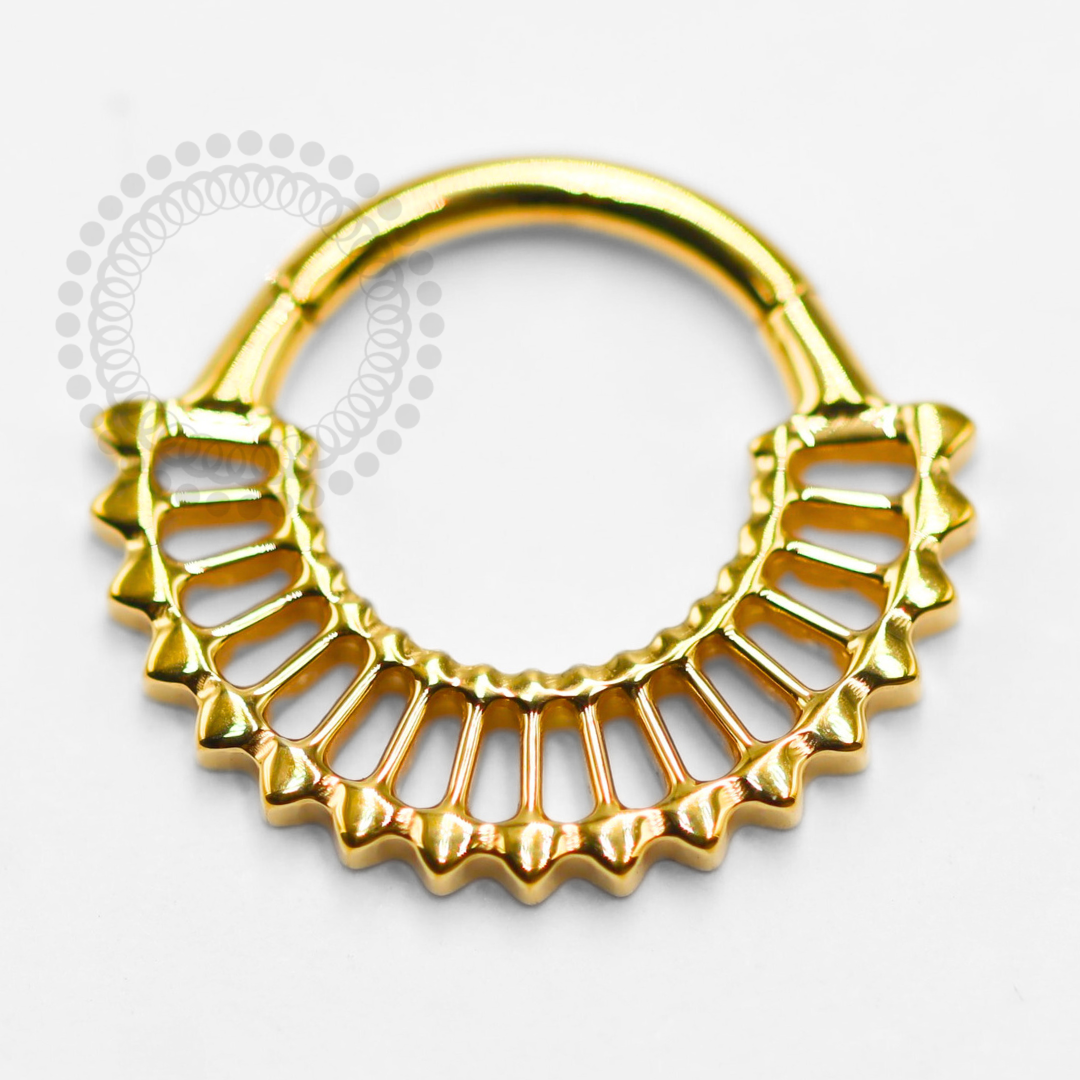 Descrição: Ideal para septo, daith, cartilagem, lóbulo, helix, entre outros piercings, oferecendo um ajuste confortável e seguro. É uma joia cheia de estilo.