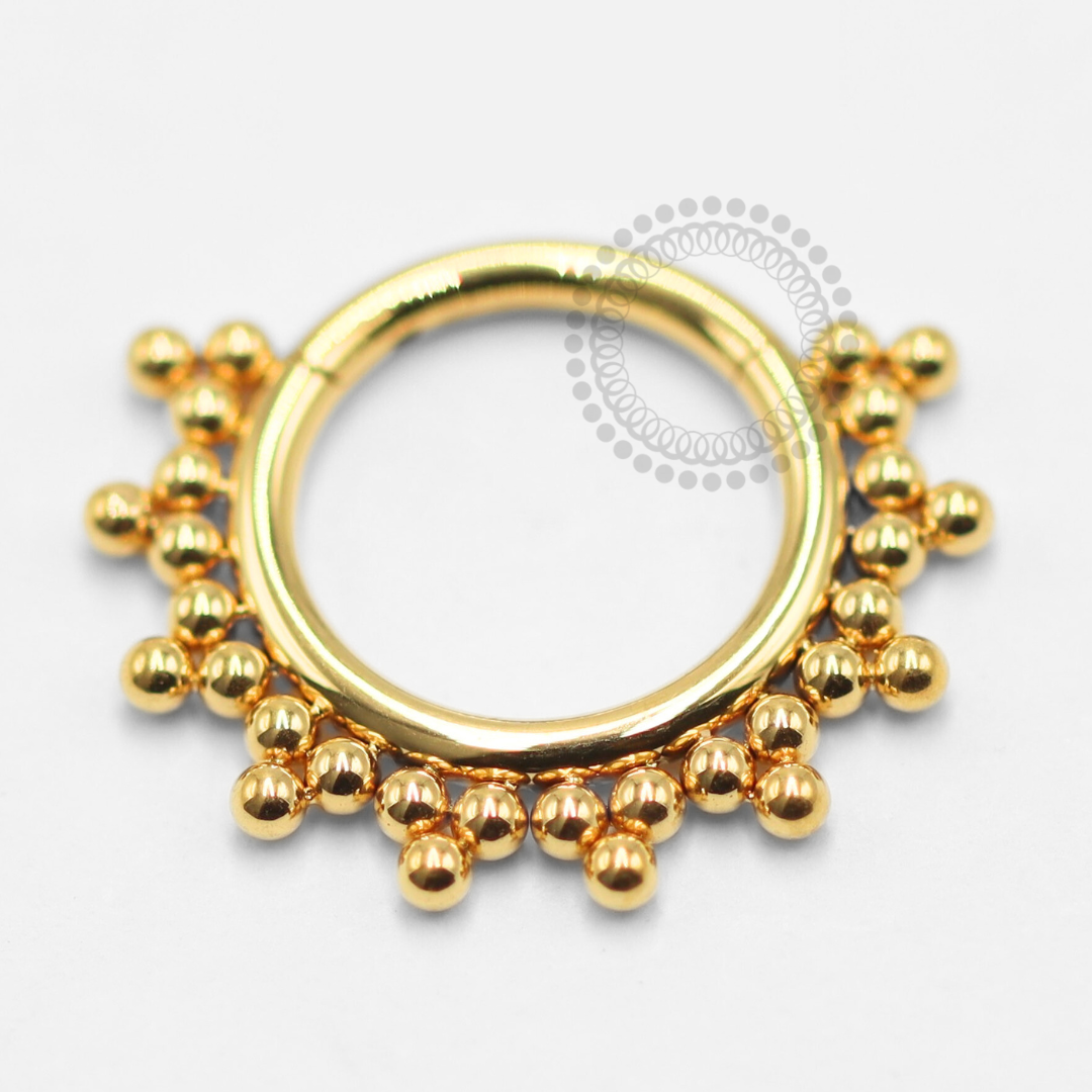 Descrição: Ideal para septo, daith, cartilagem, lóbulo, helix, entre outros piercings, oferecendo um ajuste confortável e seguro. É uma joia cheia de estilo.
