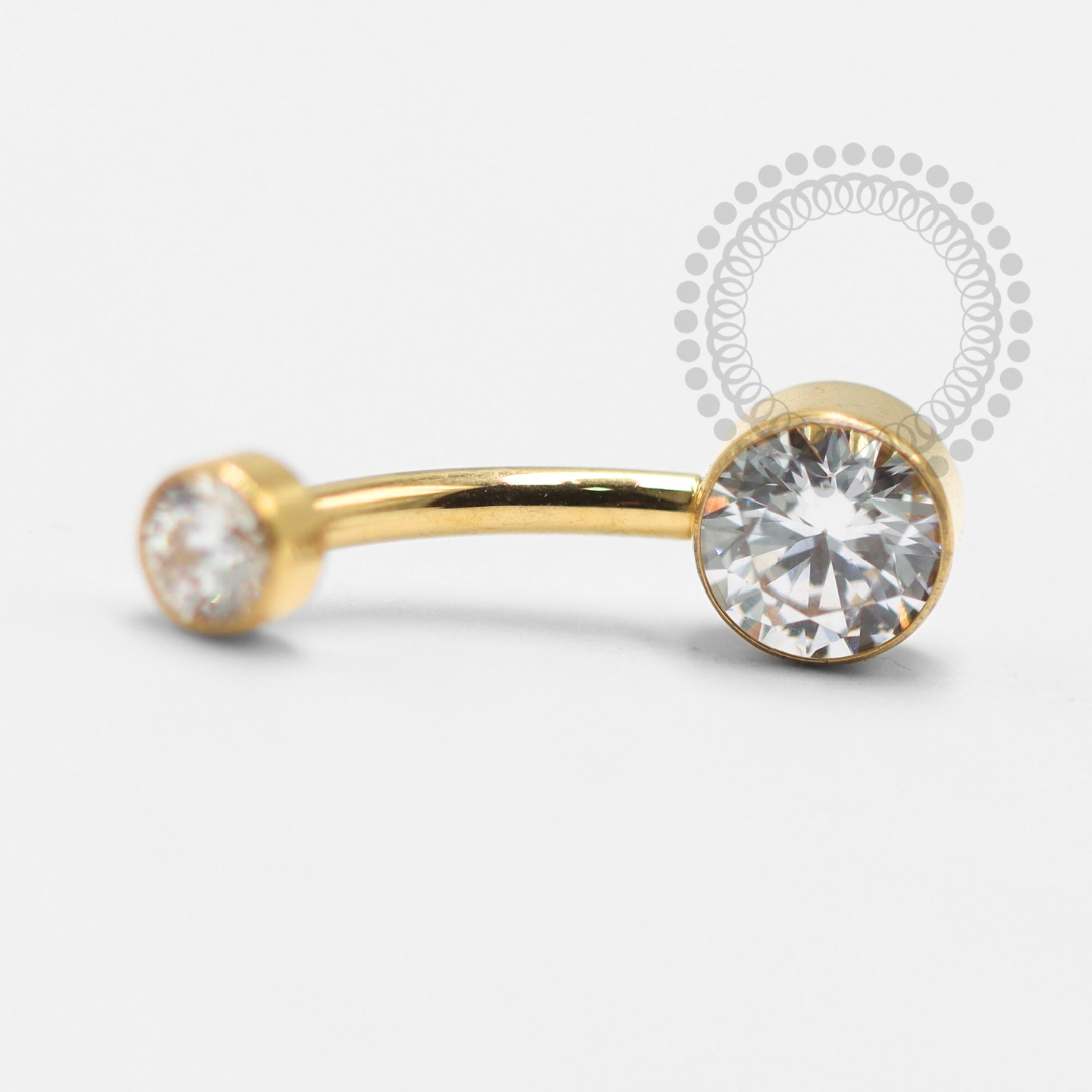 Descrição: Ideal para perfuração de umbigo, oferecendo um ajuste confortável e seguro. É uma joia cheia de estilo. O design curvado da haste permite um melhor encaixe na anatomia do corpo, minimizando o risco de irritação. Além disso, é fácil de limpar e manter, o que é essencial para garantir a saúde da perfuração.