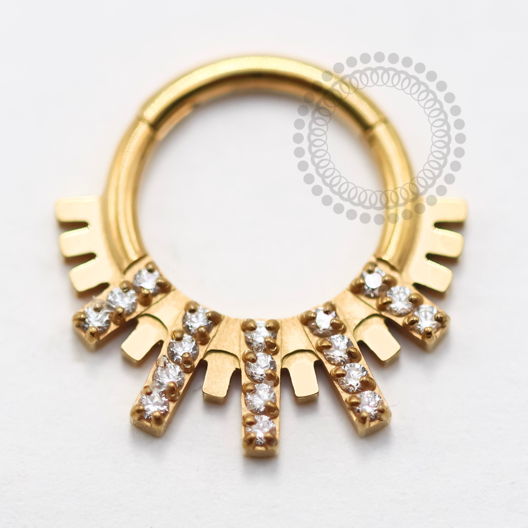 Descrição: Ideal para septo, daith, cartilagem, lóbulo, helix, entre outros piercings, oferecendo um ajuste confortável e seguro. É uma joia cheia de estilo.