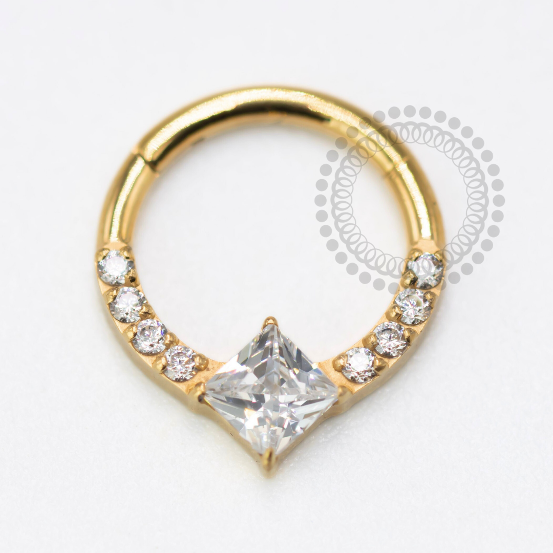 Descrição: Ideal para cartilagem, daith, septo, entre outros piercings, oferecendo um ajuste confortável e seguro. É uma joia cheia de estilo.