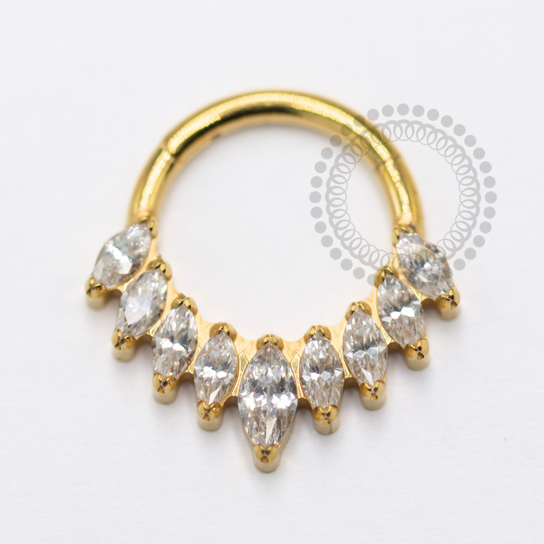 Descrição: Ideal para cartilagem, daith, septo, entre outros piercings, oferecendo um ajuste confortável e seguro. É uma joia cheia de estilo.