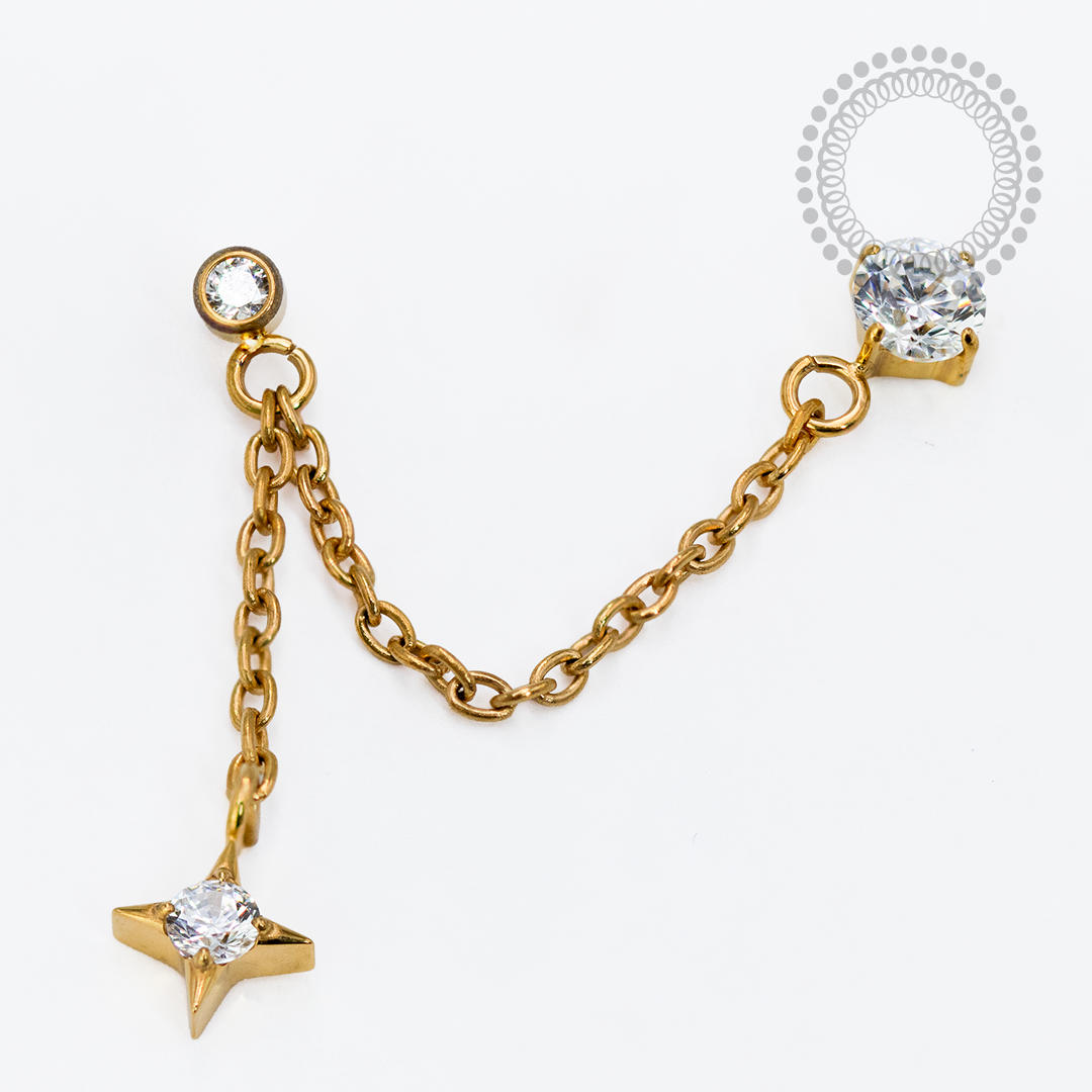 Titânio PVD Gold: É um material altamente durável e leve, que passa por um processo de deposição a vapor (PVD) para receber uma camada de ouro. Esse tratamento não só confere uma aparência luxuosa e brilhante, mas também aumenta a resistência à corrosão e ao desgaste. O titânio é conhecido por ser hipoalergênico, tornando-o uma excelente escolha para joias e piercings, especialmente para pessoas com pele sensível. A combinação de titânio com o acabamento PVD Gold oferece uma opção elegante e resistente, ideal para uso diário.