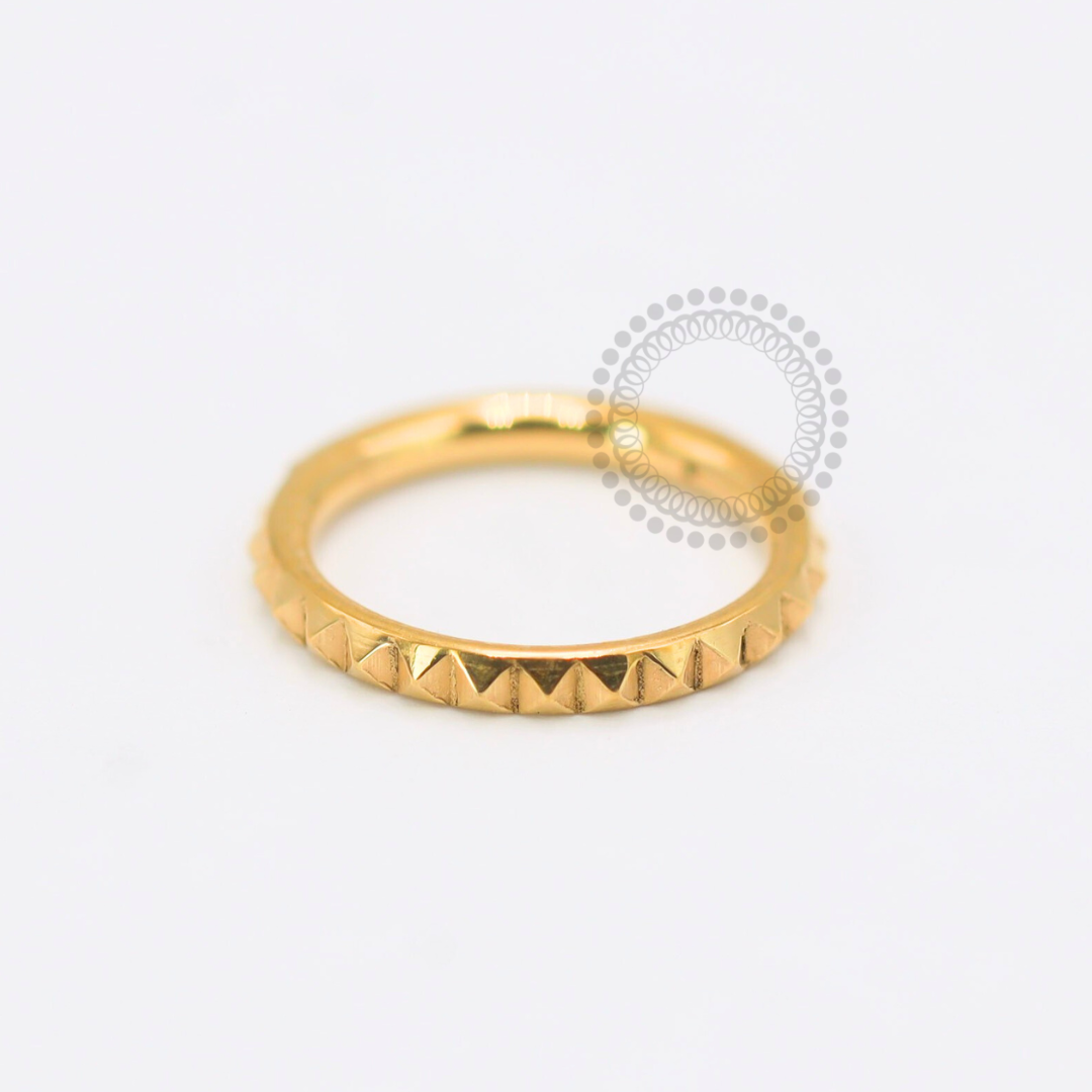 Titânio PVD Gold: É um material altamente durável e leve, que passa por um processo de deposição a vapor (PVD) para receber uma camada de ouro. Esse tratamento não só confere uma aparência luxuosa e brilhante, mas também aumenta a resistência à corrosão e ao desgaste. O titânio é conhecido por ser hipoalergênico, tornando-o uma excelente escolha para joias e piercings, especialmente para pessoas com pele sensível. A combinação de titânio com o acabamento PVD Gold oferece uma opção elegante e resistente, ideal para uso diário.