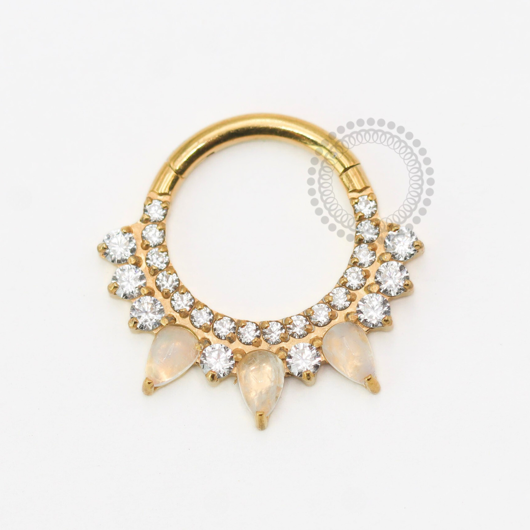 Descrição: Ideal para cartilagem, daith, septo, entre outros piercings, oferecendo um ajuste confortável e seguro. É uma joia cheia de estilo.