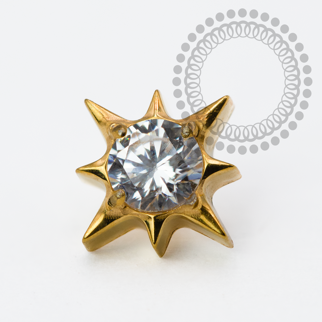 Titânio PVD Gold: É um material altamente durável e leve, que passa por um processo de deposição a vapor (PVD) para receber uma camada de ouro. Esse tratamento não só confere uma aparência luxuosa e brilhante, mas também aumenta a resistência à corrosão e ao desgaste. O titânio é conhecido por ser hipoalergênico, tornando-o uma excelente escolha para joias e piercings, especialmente para pessoas com pele sensível. A combinação de titânio com o acabamento PVD Gold oferece uma opção elegante e resistente, ideal para uso diário.