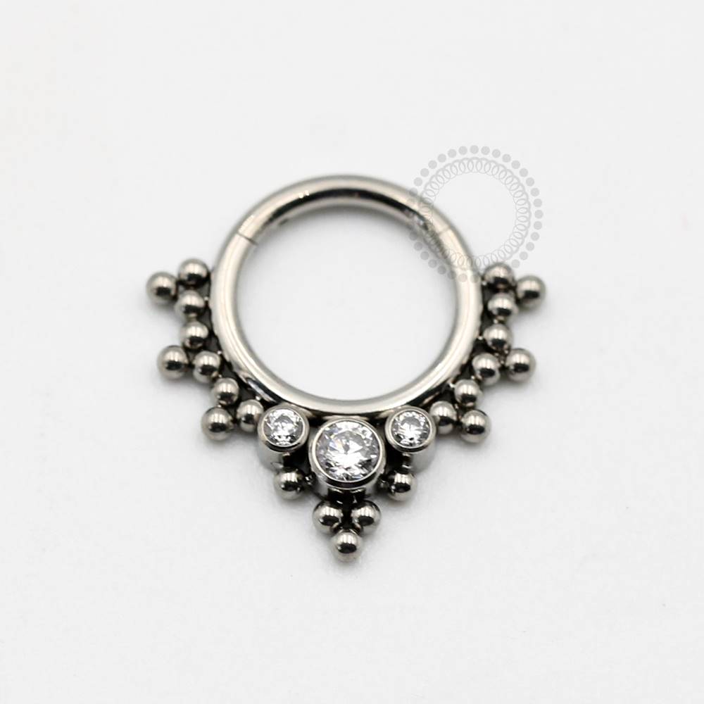 Descrição: Ideal para cartilagem, daith, septo, entre outros piercings, oferecendo um ajuste confortável e seguro. É uma joia cheia de estilo.
