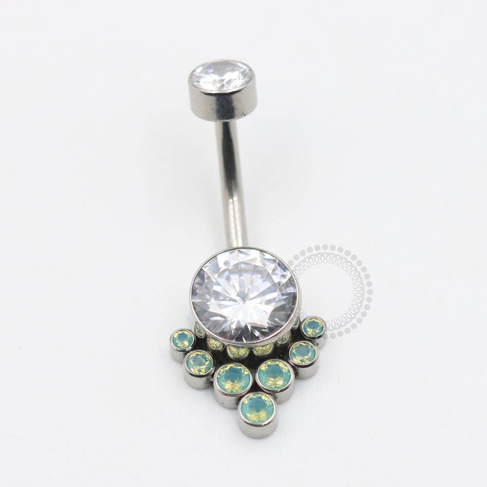 Opalite Green Sintética: É uma gema criada em laboratório com um brilho cintilante e uma tonalidade verde suave, que lembra a opala natural. Popular em joalheria, ela traz um toque de elegância e originalidade a brincos e piercings.