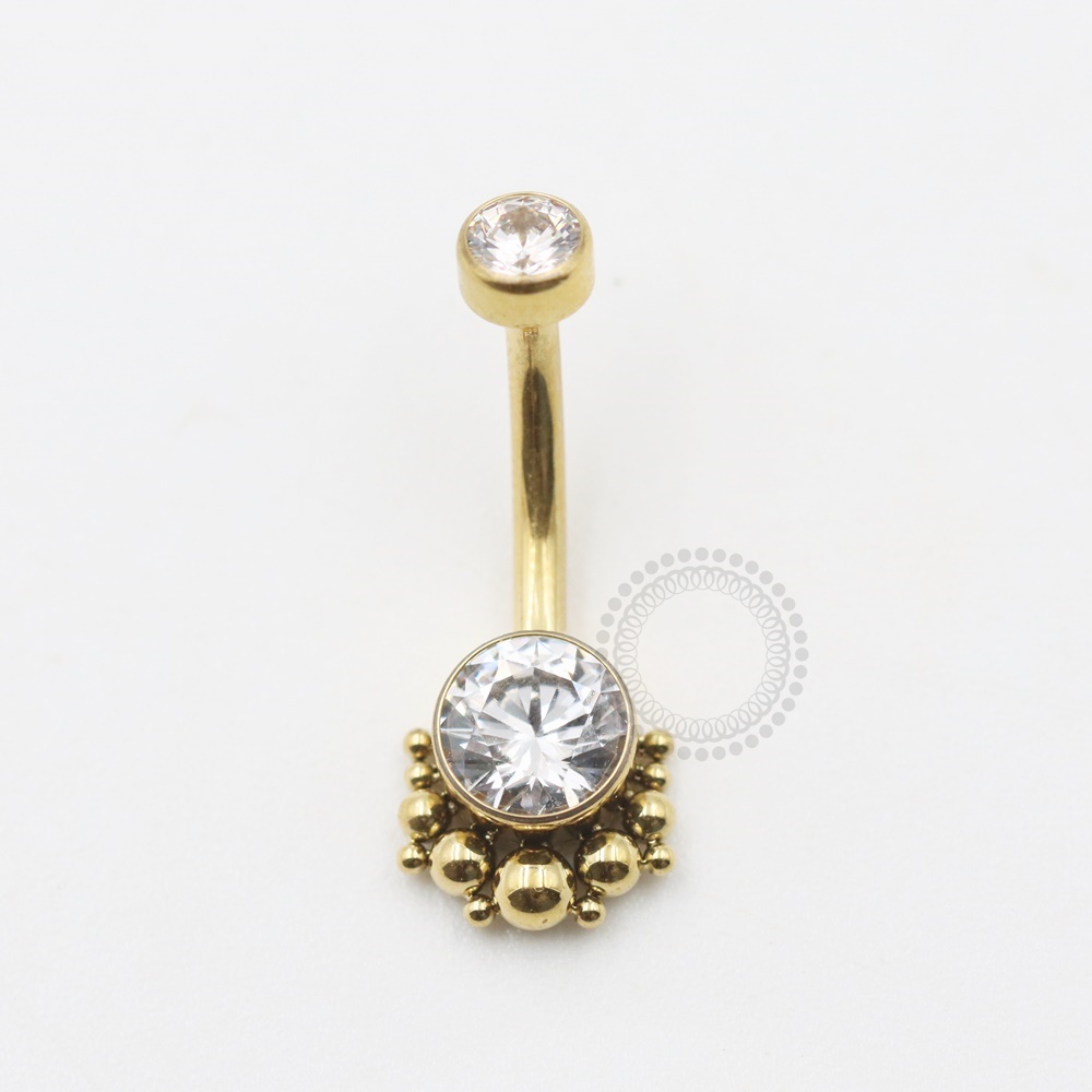 Descrição: Ideal para perfuração de umbigo, oferecendo um ajuste confortável e seguro. É uma joia cheia de estilo. O design curvado da haste permite um melhor encaixe na anatomia do corpo, minimizando o risco de irritação. Além disso, é fácil de limpar e manter, o que é essencial para garantir a saúde da perfuração.